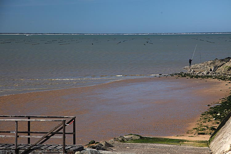 Nach dem Frühstück machen wir uns reisefertig und uns auf den Weg zum Pointe de L Aiguillon. Dort sehen wir gerade noch die Stempen der Austernzuchten in der Flut verschwinden.