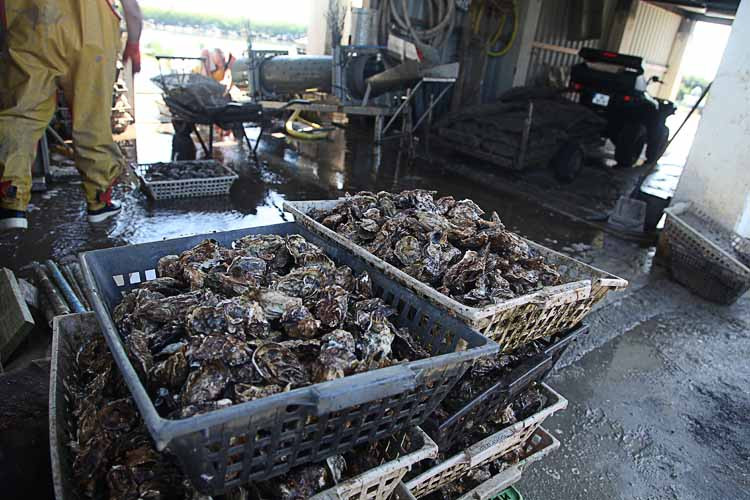 Bei einem Geschäft sehen wir das erste Mal eine Austernwaschmaschine in Betrieb.