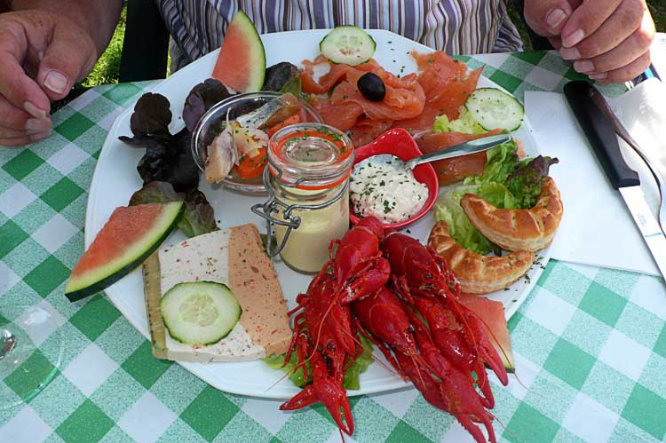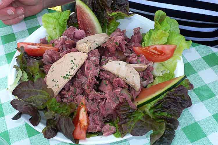 Nach 4 ½ Stunden kommen wir zurück und gehen erst einmal was trinken. Weil die Salate so gut aussehen bestellen wir für Alfred einen Salat Marine (4 Flusskrebse, jede Menge Lachs, ein Schälchen Heringe, einige Saucen und ein paar Blätter Salat) für Renate einen Salat Vandeene ( Rohschinken, verschiedene Käsesorten, Schnecken und Schafkäse auf Toastscheiben). Brigitte hat einen Salat mit Entenbrust bestellt, Frankie ein Entrecote (300 g) mit Pommes.