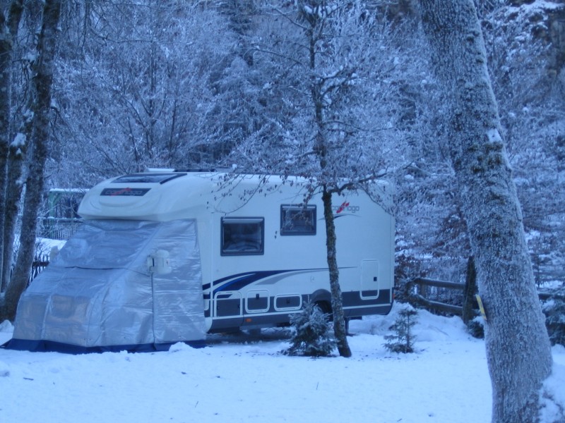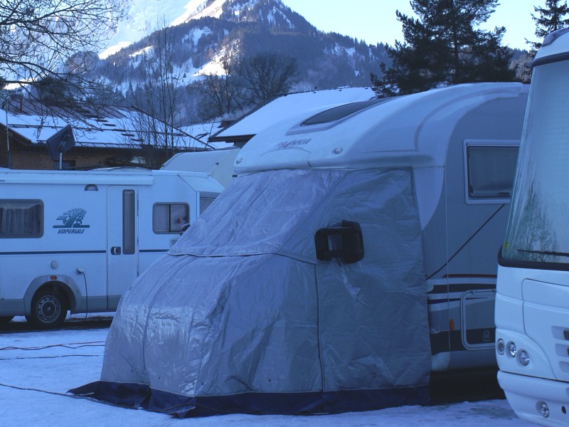 Diese reicht von der Dachkante bis zur Motorhaube, daran wir mit Reissverschluß ein weiteres Teil angebracht welches über die Kotflügel und Frontbereich bis auf die Fahrbahn reicht. Die Seitenteile im Türbereich reichen ebenfalls bis "unten hin" und werden mit dem Teil über der Motorhaube mit Klett verbunden. Damit ist der gesamte Fahrerraum von aussen isoliert. Bisher - nach drei Winter - sind wir damit zufrieden. Für den Abwassertank zu heizen - liegt ja aussen - gibt es im Zubehör eine kleine Heizmatte in zwei verschiedenen Größen (Weltraumtechnik) für ca. 80€. Die kleinere soll ca. 100 ltr. Wasser bis etwa -40 Grad flüssig halten, na ja, aber bis -15 Grad hat es bei uns funktioniert. Alles ist im dicken Zubehörkatalog zu finden. Auch Frankia hat Doppelboden und wird hier meistens vergessen zu erwähnen. Wir fahren einen TI von Frankia und sind immer auch im Winter unterwegs. Allerdings geht das nicht ohne Abdeckung des Fahrerhaus. Hier unsere von Wigo: ![]()