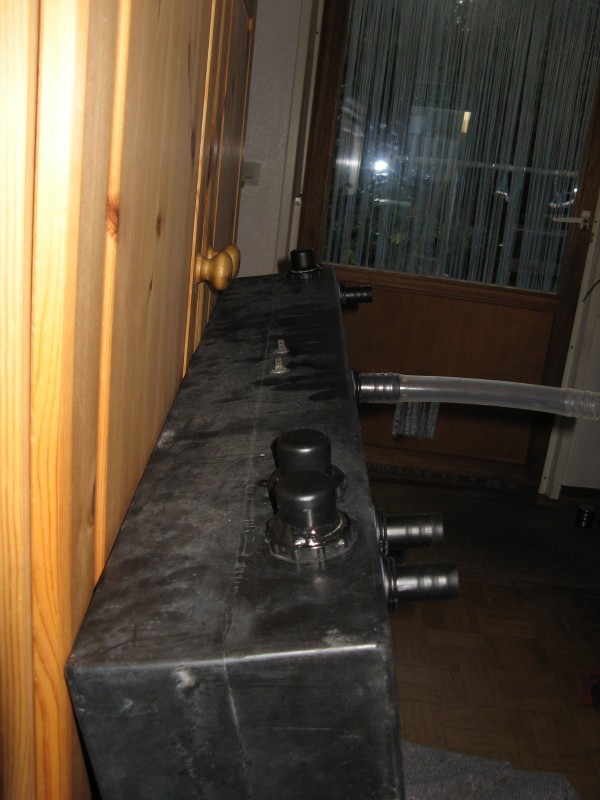 Der Schlauch nach oben ist der neue Überlauf ... weil, die alten Überläufe waren einfach nur zwei seitlich im Tank gebohrte Löcher, die ich verschlossen habe.