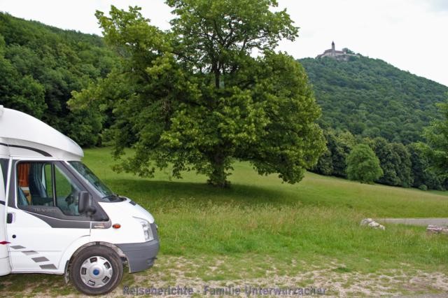 Mehrere Parkplätze stehen im Gebiet unter der Burg Teck zur Verfügung. Teisl unter Bäumen teils auf Schotterplätzen im freien.