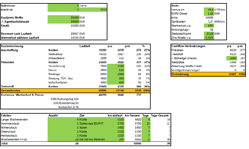 ich finde deine exeltabelle interessant. da ich seit 2006 im Womo lebte und arbeitete, habe ich mal ähnliches fürs finanzamt gebastelt. und das ist eben die crux.. "eines schickt sich nicht für alle" smile. wer wirklich wissen will, was in sein womo kostet, findet das anhand der persönlichen gegebenheiten selbst raus. die in deiner tabelle hinterlegten formeln hab ich mir nicht angeschaut. für mich kommt da ein wert von 600 € im monat raus, bei 300 tage nutzung und 20000 km anno. der passt aber nicht, weil für mich fürs 300 tage anno wohnen, kosten für gas und wasser nicht einzugeben sind. trotzdem glückwunsch! schöne idee. lg magda