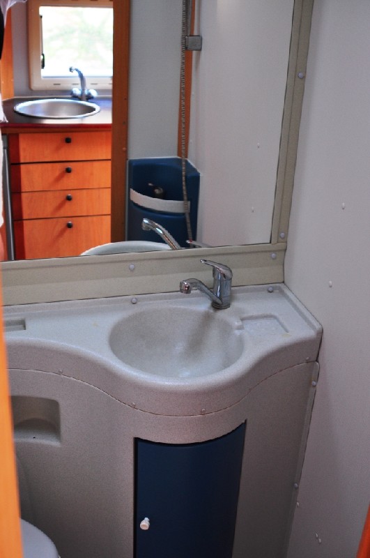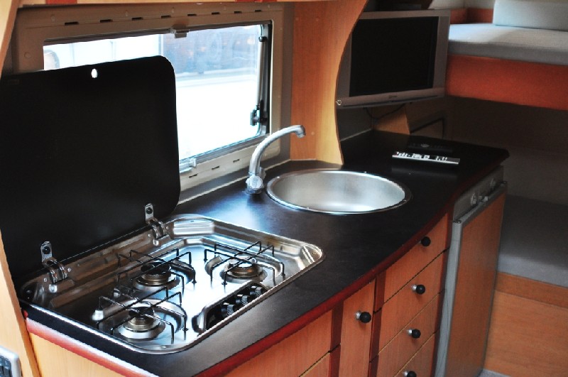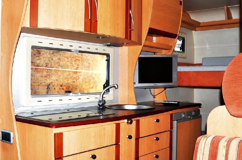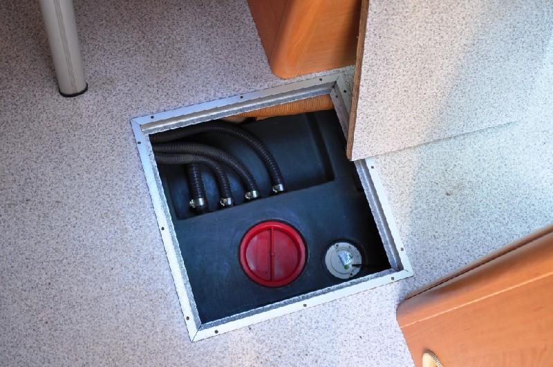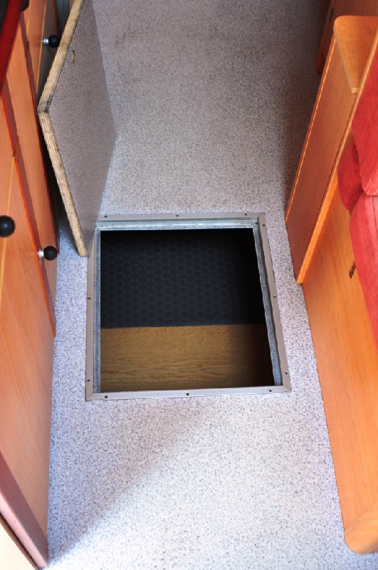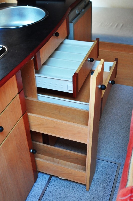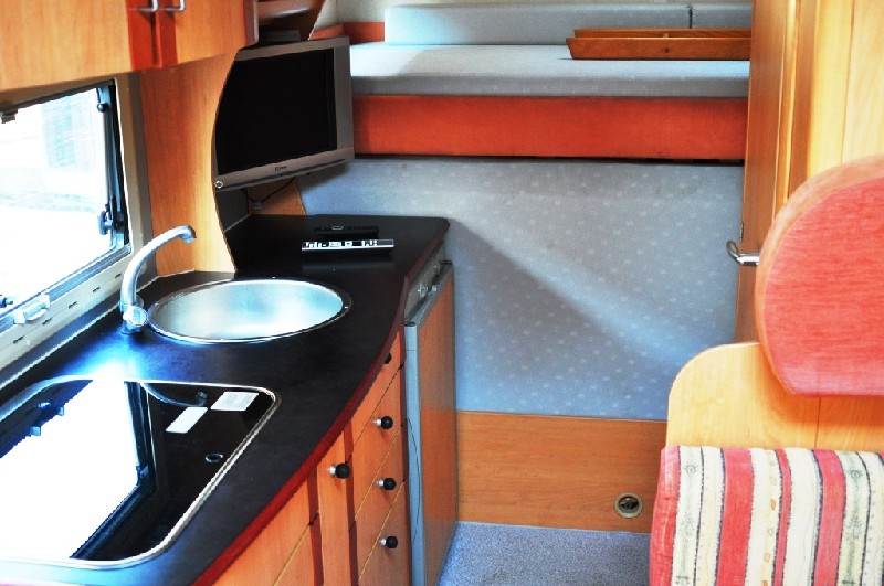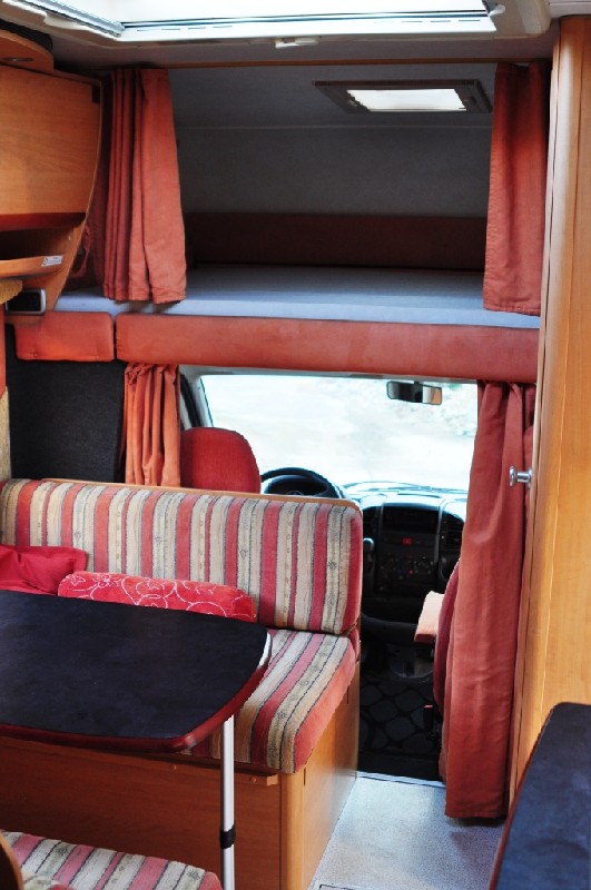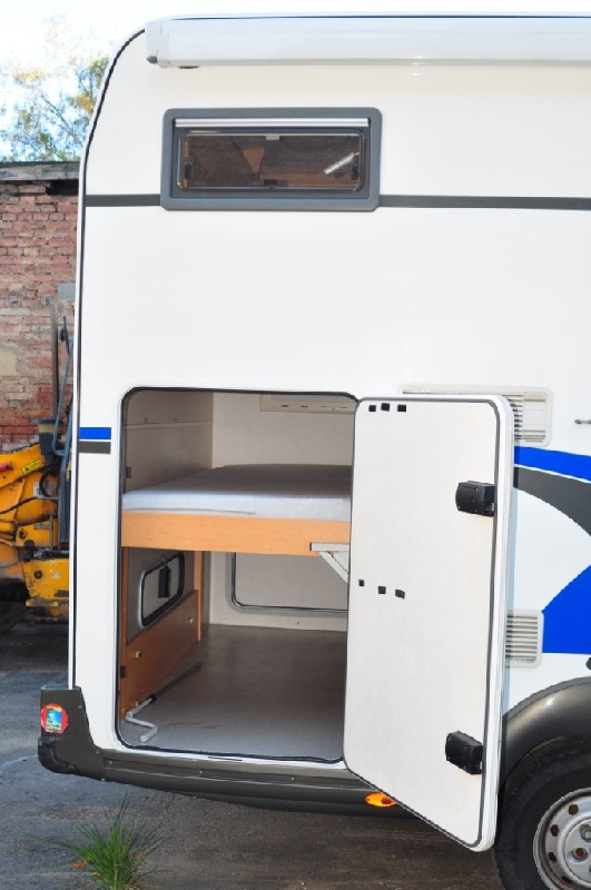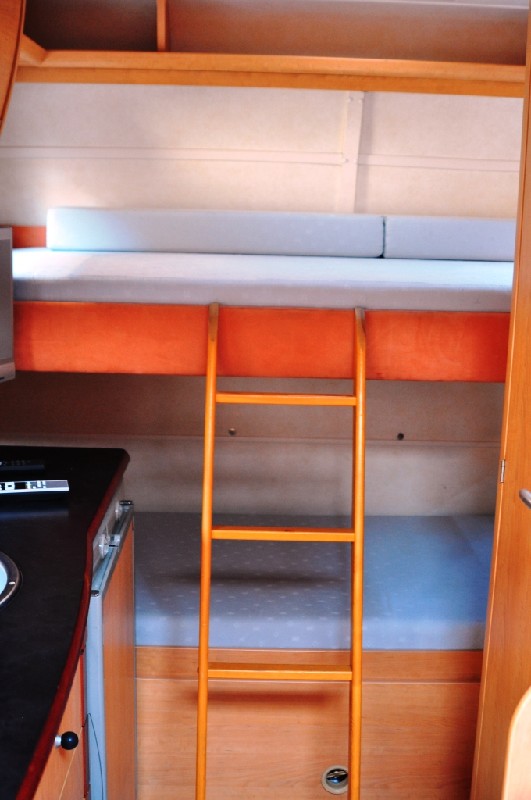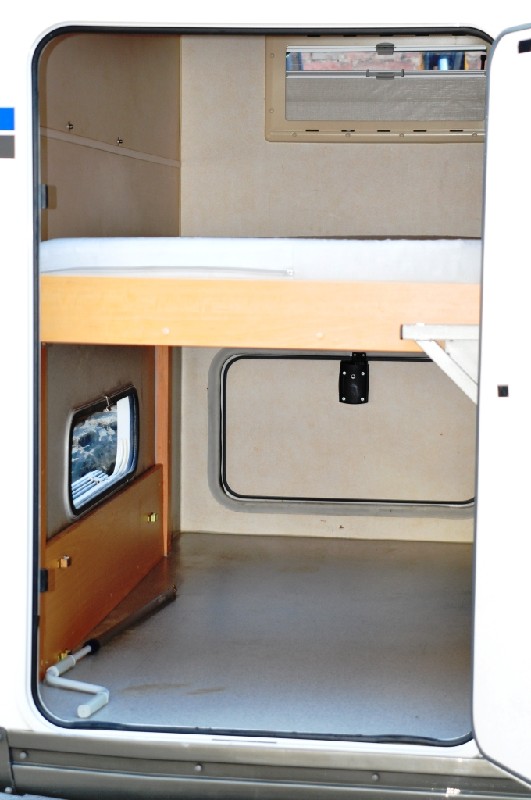 Tolle Raumaufteilung mit klappbarem Stockbett. Der Möbelbau ist wesentlich besser als Dethleffs. Und der Doppelboden ist Gold wert.