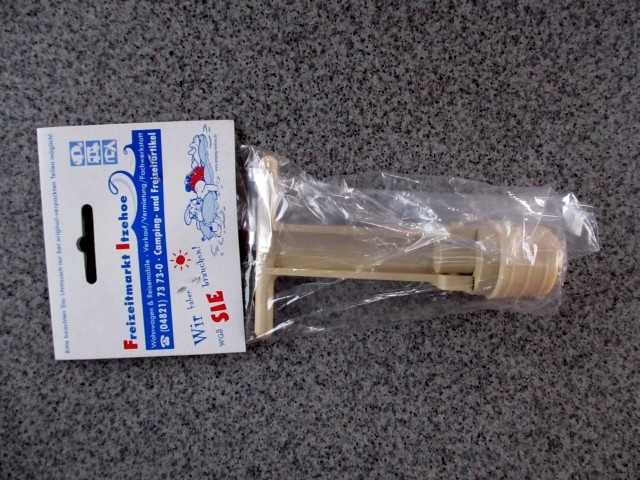 Hallo, wir haben ein Dethleffs- Womo, das gerade mal vier Jahre jung ist. Vor einiger Zeit ist der Stöpsel des Frischwassertanks gebrochen. Es ist so einer, der gesteckt und anschließend abgeknickt wird, dadurch wird die Dichtigkeit erreicht. Ich hab das Ding jetzt mit der Heißklebepistole, einer Schraube und einer großen Beilagscheibe einigermaßen repariert, werde aber über kurz oder lang um eine Neuanschaffung nicht herumkommen. Weiß von Euch jemand einen Internet- Händler, ich habe nämlich keinen Bock, für ds Plastikteil zum nächsten Händler zu fahren, der ist weiter entfernt.