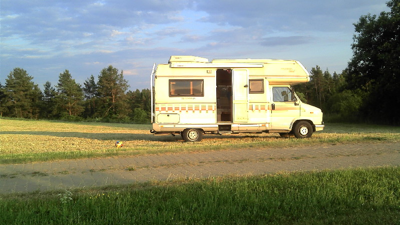 wir haben ein 91er Frankia Wohnmobil, Alkoven, mit 75-Diesel-PS auf Ducato-Basis.