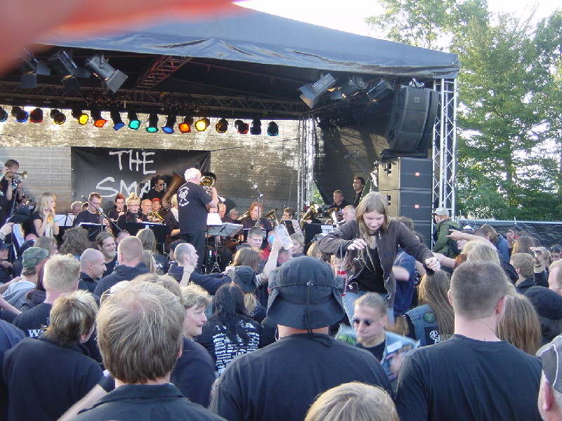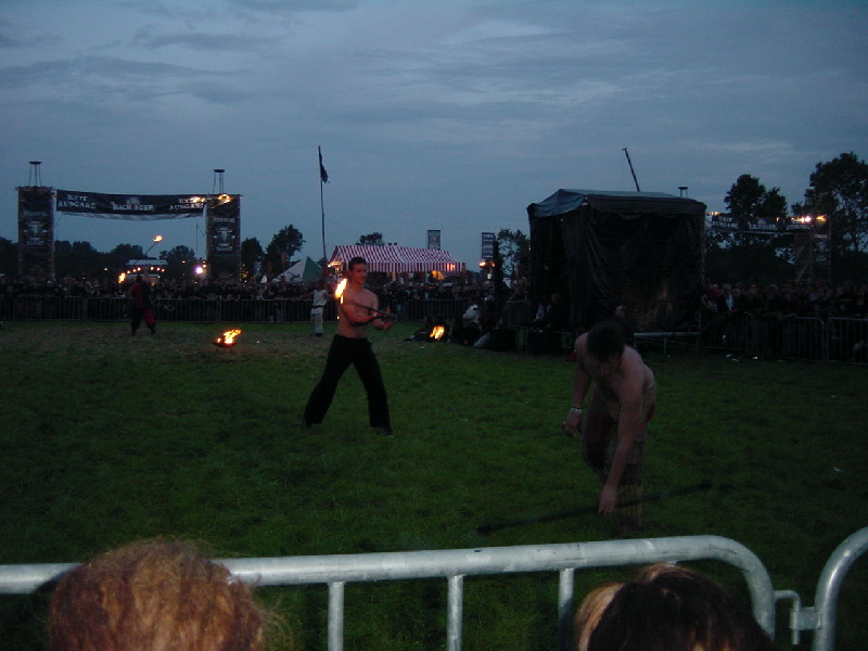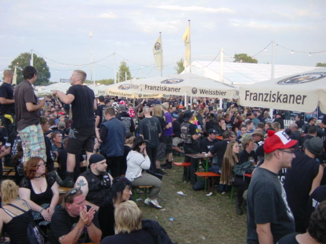 Danach gab es die ersten Bierchen, wie sich das gehört. Aber wir mußten ja noch unsere Eintrittsbändchen holen, was nach jahrelanger Erfahrung auch mal ein paar Stunden dauern kann. Doch diesmal war es halb so schlimm, in einer knappen halben Stunde hatten wir unsere Bändchen und das Metalbag, wieder gefüllt mit viel Werbung und einigen Gimmicks, wie Ohrstöpsel, Kondom und Autoaufklebern.