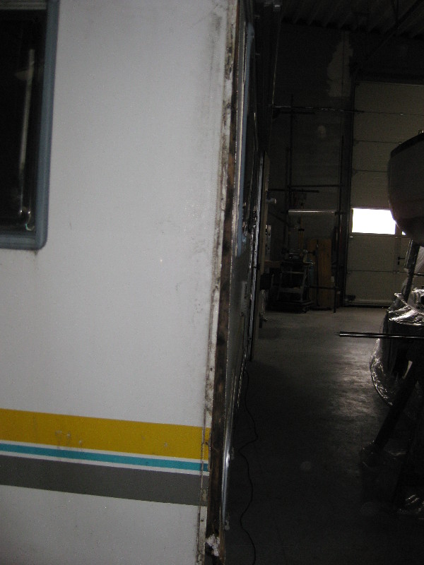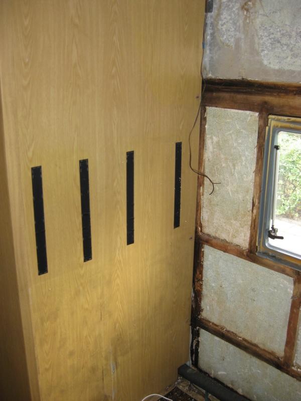 Aufgrund der losen Wände, die noch nicht mit der neuen hinteren Bodenplatte verbunden waren, und meiner Rumturnerei auf dem Dach, hat sich das ganze Heck um 4 cm gesenkt. Dadurch auch in beiden Seitenwänden eine grosse Beule.