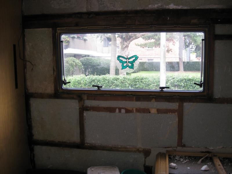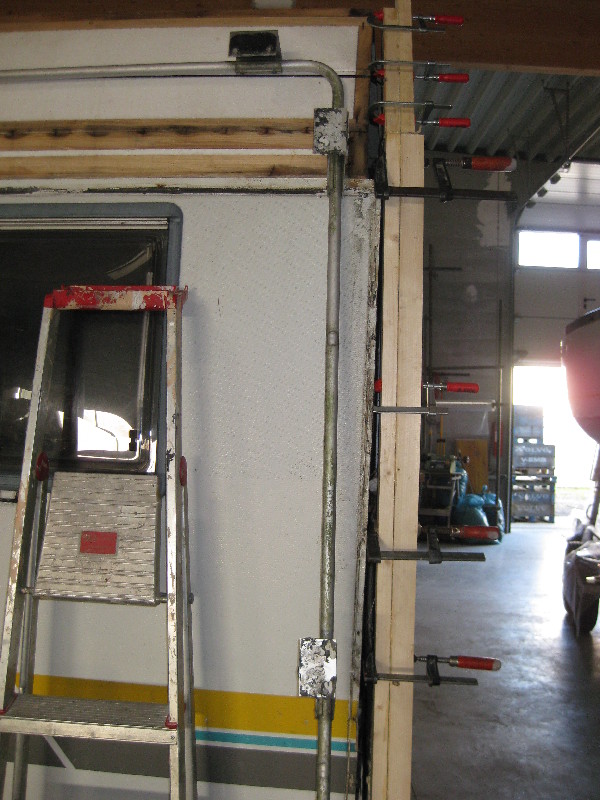 Also, hinteres Fenster ausgebaut und und mit dem Wagenheber über den Fensterausschnitt das Heck angehoben, verklebt und verschraubt.