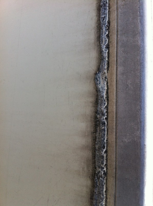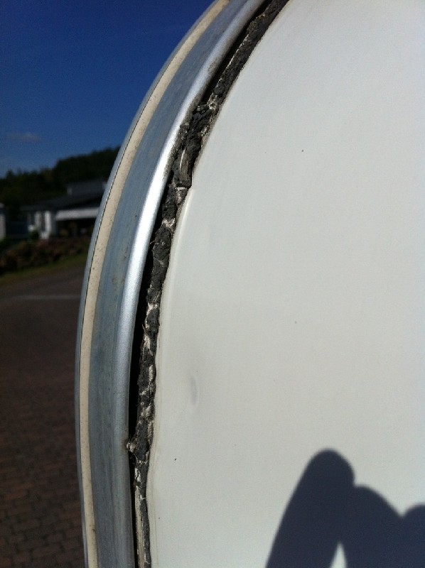 Die Dichtungen an den Seitenleisten sind schwarz vom Straßenruß und es steht Dichtmasse klebrig rausgequollen ab.