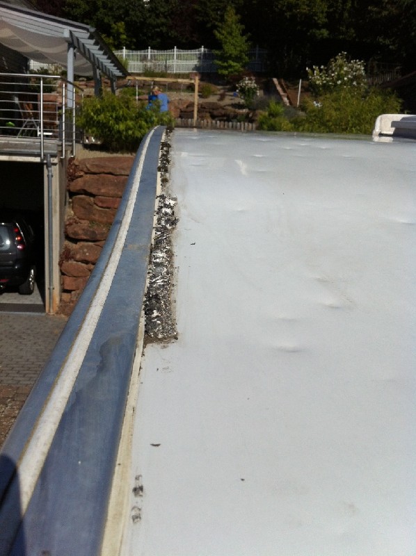 Das Dach ist eine lose verlegte Aluhaut mit vielen Hageldellen, an den Rändern steht auch Dichtmasse über und die ist von trockenem Moos bewuchert.