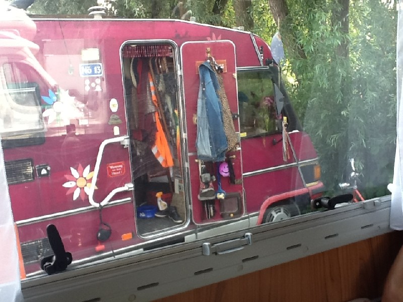 Find ich ja klasse - Hippie und pinke Farbe am Womo - aber dann solch praktische Accessoires (ich nehm mal an, die sind nimmer Anfang 20) :)