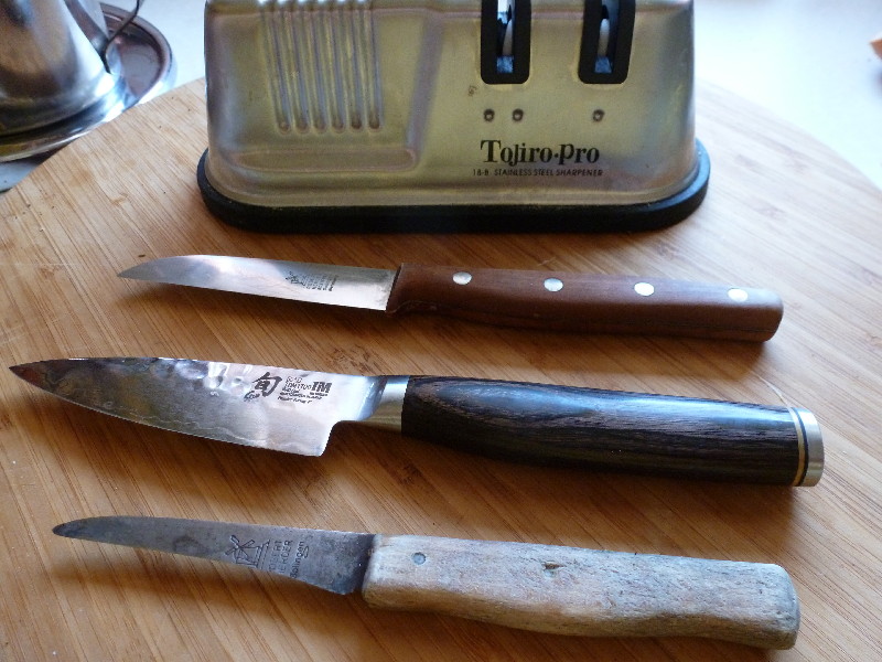 Zum Schneiden haben wir so bunte Messer, keine Ahnung von wem, die sich gut nachschärfen lassen. Da meine bessere Hälfte diese Messer auch zum Schneiden von Pappe etc. nimmt, möchte ich gar nicht so teure Teilchen haben, es würde mir jedesmal den Magen umdrehen.