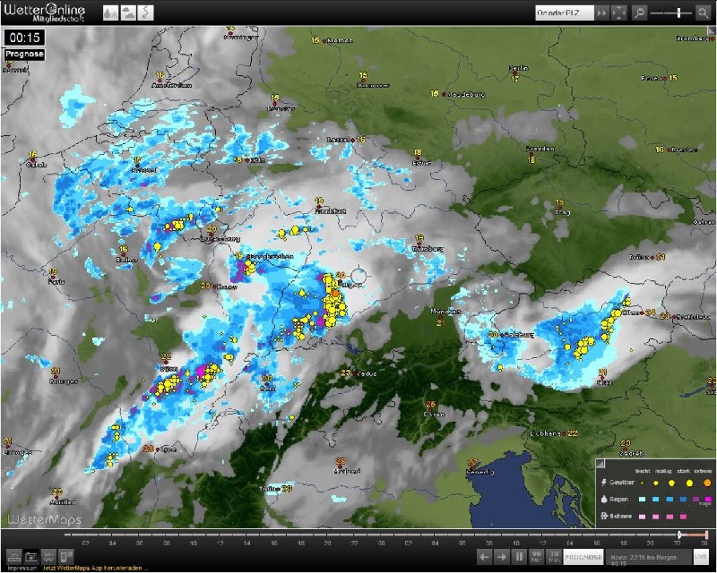 ach, bei uns - ingolstädter raum - hats net mal gegrollt....es ist sauschwül, und ich mag gar net hinausgehen. die luft, die steht, und ich hoff, es wird in der nacht gscheit schütten, damit unser wohnidach wieder sauber wird... Und wenn man das hier anschaut, dann wohl bald auch Südbaden: --> Link