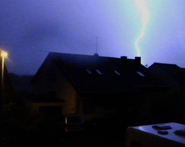 Nöh, Hymer hat noch welche. :D Außerdem denke ich positiv, dann wird schon nichts passieren. :) Die Flachzelle war abgedeckt. Da traue ich nicht so recht bei Hagel. Es war kurz und heftig. Aber es war hauptsächlich saumäßiger Sturm mit extremen Böen und nur mäßiger Regen. Allerdings Blitze ohne Ende und gleich mehrere in unmittelbaren Nähe. Für eine Sekunde war es sogar ganz dunkel (Strom weg), als beim Nachbar (oder weiter unten am Berg?) ein dicker Blitz mit rießen Paukenschlag eingeschlagen hat (siehe Bild Seite zuvor). Das hat einem fast umgehauen, so laut war das. Die Katzen haben sich irgendwo verkrochen, die Frau ist nervös - ich finde es einfach nur hammermäßig "Naturhaft". Jetzt regnet es recht kräfig, aber ich denke wir sind durch. Habe den Sturm auf Video, Bild schlecht, Ton sehr beindruckend. Unterm Strich: Glück gehabt. Aber ich denke im Raum Reutlingen Metzingen dürfte es übel abgegangen sein. Nachtrag: Im Garten hat es mit ein 3m Gestell mit Andengurken umgeworfen. Dürften wohl 90% der Wurzeln ausgerissen sein :( Tja, so ist das Leben halt, da muss ich durch. (HimmelHerrGottsKruzi............) Guude!