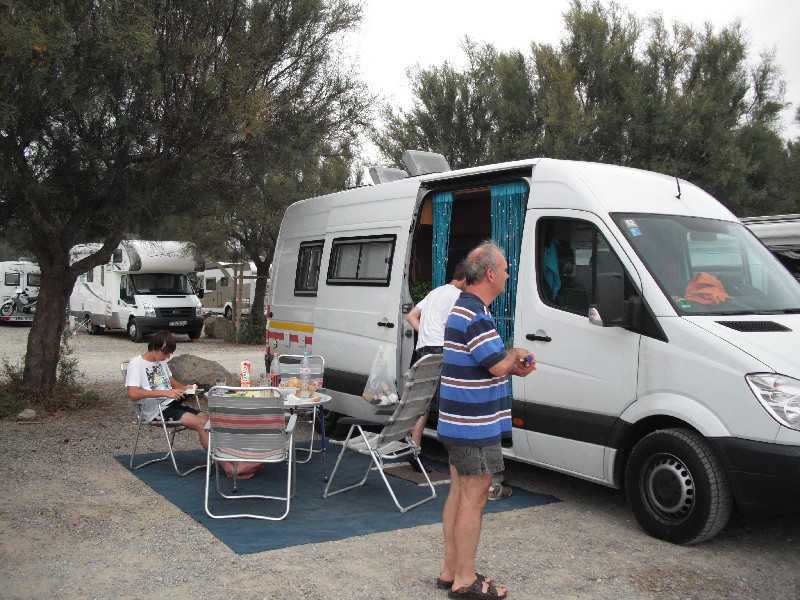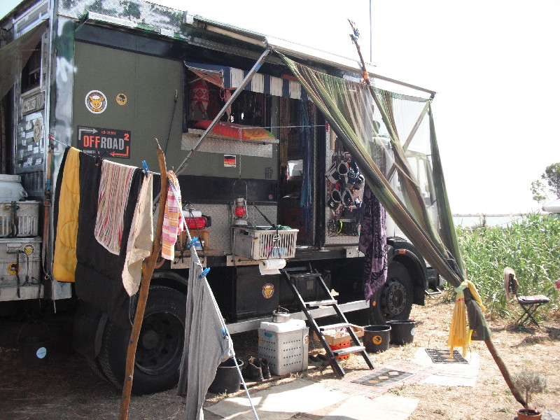 dann endlich angekommen am Mittelmeer, Narbonne Plage, leider dafr man da nur 2 Nächte stehen bleiben, dann mussten wir weiter. Sind dann auf den Stellplatz ganz in der Nähe für 4 Nächte Etang de Mateille bei Gruissan, und da haben wir dann was erlebt, einen Aussteiger, mit einem meiner Meinung nach einzigartigen Fahrzeug. Der Aufbau soll 60 Jahre und von seinem Vater sein, erzählte er uns.
