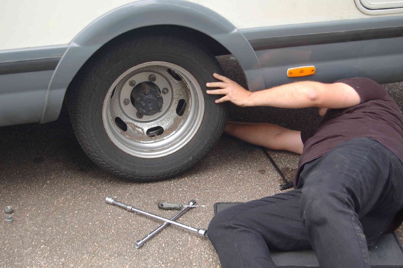 Wir müssen dringend ver- und entsorgen. Außerdem regnet es in Strömen, also brechen wir nach dem Frühstück auf und fahren nach Sunne. Hier kaufen wir beim ICA ein, das Klohaus am Parkplatz nutzen wir zum ver- und entsorgen. Danach soll es weiter gehen zur Draisinefahrt in Uddeholm. Leider vera...uns unser Navi und schickt uns 40km in die falsche Richtung. So kommen wir als letzte in Uddeholm an. Es regnet aber immer noch in Strömen und so beschließen wir weiter zu fahren nach Orsa zum Bärenpark Grönklitten. Lars möchte bei uns mit fahren, Klaus wird eine andere Strecke fahren und sich Dala Floda anschauen. Nach ca. 45km tut es bei gemächlicher Fahrt mit ca. 90 km/h auf freier Strecke plötzlich einen heftigen Schlag. Es fühlt sich an, als wären wir auf der rechten Seite über etwas drüber gefahren. Christian kommt mit seinem Womo und hält an. Wir fragen ihn, ob etwas auf der Straße lag, er verneint dies. Also beschließen wir weiter zu fahren. Während des Anhaltens war mir aufgefallen, dass das Bremspedal einen zu weiten Weg hat. Während der Weiterfahrt stelle ich fest, die Bremse ist tatsächlich nicht in Ordnung, außerdem stinkt es nach verbranntem Belag. In Stöllet biege ich daher kurzentschlossen vor dem örtlichen Tante-Emma Laden nach links ab und stelle das Womo auf einen Parkplatz vor einer aufgegebenen Bankfilliale. Aus der linken Bremstrommel qualmt es, die Trommel ist sehr heiß.