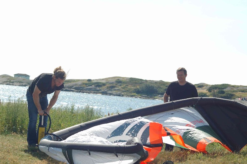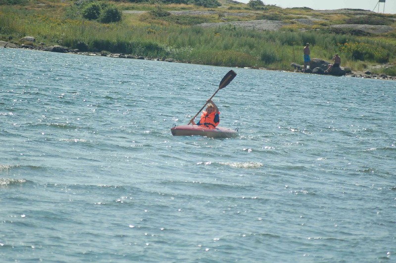 Wir fahren nach dem späten Frühstück ca. 150km nach Varberg, dort soll ein Kite-Point sein, an dem Christian nach Möglichkeit kiten möchte. Der Parkplatz an Strand bietet ein Luxusklohaus mit Toiletten und Außenwasseranschluss. Die Kinder gehen baden, Marc und Fabian versuchen zu paddeln, leider ist die Bucht so flach, dass das Boot ständig auf Sandbänken aufsetzt.
