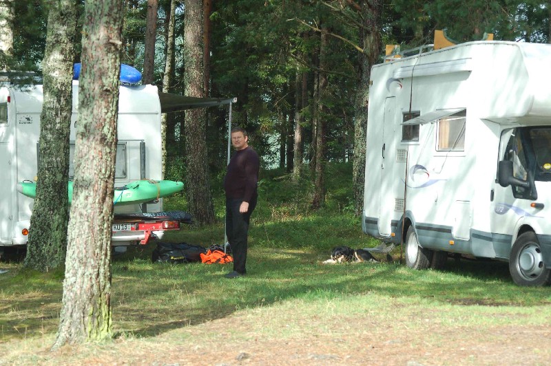 Vor uns liegen ziemlich genau 400km, eine weite Strecke. Unterwegs kaufen wir ein, ver- und entsorgen an einer Tankstelle bzw. einem Klohaus und erreichen erschöpft gegen 16.00 Uhr Dala Floda. Wir steuern den örtlichen Badeplatz an und richten uns ein. Klaus läuft zum Kanu-Center und berichtet, dass es geschlossen scheint und keine Öffnungszeiten anstehen. Gegen 18 Uhr kommt eine Schwedin und bittet uns den Platz zu verlassen, es fände heute ein Nachbarschaftsfest statt und wir würden dann gestört (bzw. wir stören) Wir fahren 2 verschiedene Plätze lt. Karte an bzw. versuchen dies, ein Platz ist nicht erreichbar, die Naturstraße ist 30cm hoch aufgewühlt. Die örtlichen Anwohner warnen uns weiter zu fahren, ich bin schon ausgestiegen und zu Fuß auf Erkundung. Also müssen wir ca. 1km rückwärts auf dem engen Weg fahren, bis wir drehen können.
