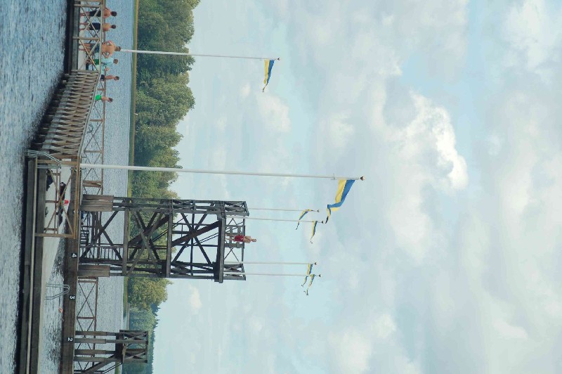Christian beginnt eine Heuschlacht und danach sehen alle entsprechend aus. Danach fahren wir zu einem nahegelegnen Stellplatz im Wald und alle stürzen sich ins relativ warme Wasser des Sees. Am Abend machen wir ein Abschiedslagerfeuer, Christian und seine Familie brechen um 21.00 Uhr auf zur Fähre.