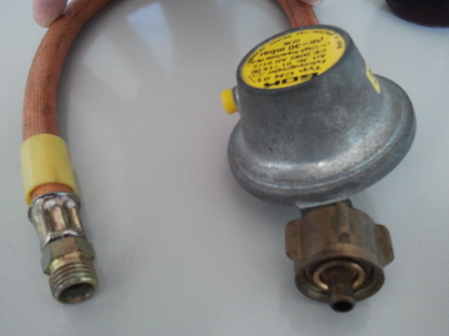 Ich habe einen Gasgrill (o-Grill 3000) mit integriertem Druckminderer gekauft. Dabei war ein 1m langer Hochdruck-Schlauch mit einem Spezial(?)-Anschluß auf der Grill-Seite und einem herkömmlichen Gasflaschen-Anschluß auf der anderen Seite (siehe Bild1 unten), so dass ich den Grill ohne Probleme an eine 11kg Flasche anschließen kann.