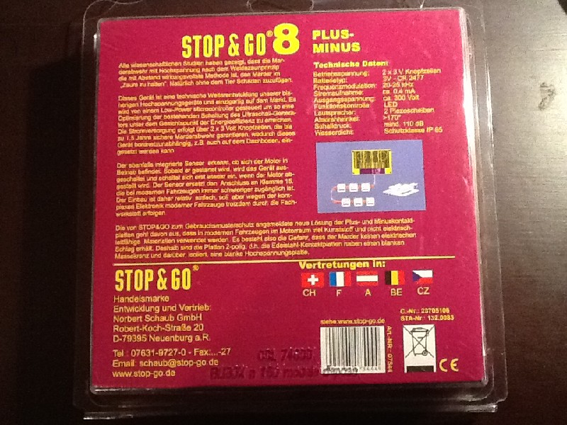Bei unserem Wohnmobil war schon traditionell der Unterdruckschlauch für den Turbolader kaputt. Seit wir das Gerät haben, haben wir Ruhe. Vergisst man allerdings, die Batterie irgendwann zu wechseln, dann ist er schnell wieder da. So wie gestern im Trafic geschehen, da hat der Kollege den Schlauch der Waschanlage zerlegt. Daher meine ich, unser Gerät hilft bei unseren Mardern.