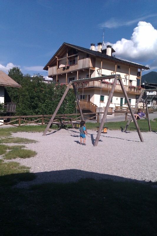 Ordentlich Pause machen? Hier? Hier ist Berg und Straße. Das Kind will unbedingt mit seinem Spielzeuglaster (der fast größer ist als er selbst) spielen und Mama ist mit den Nerven runter. Es ist mittlerweile 15.30h und wir haben angst nicht mehr rechtzeitig auf dem CP anzukommen, die haben doch irgendwann Nachtruhe??? Gut, wir rufen an und fragen, bis wann wir anreisen können. Die Antwort ist: Es sind gar keine Stellplätze mehr frei. Ahhhhhh, gestrandet in den Dolomiten und ohne Aussicht auf Besserung. Schweigend und demotiviert fahren wir nach 45min weiter, sogar das Radio lassen wir aus. Nur das Kind brüllt. Als wir durch Piave di Cadore fahren reißt mir der Faden und als ich aus dem Augenwinkel einen großen Parkplatz umd einen Spielplatz sehe, zwinge ich meinen Mann zum anhalten.