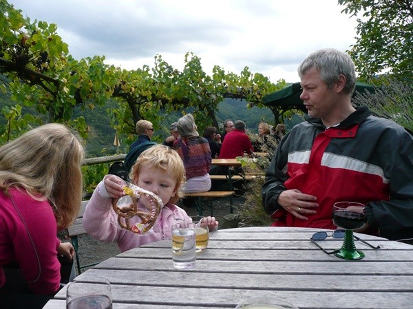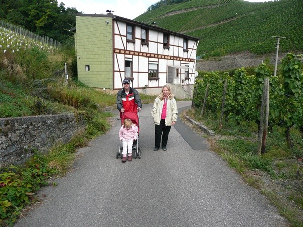 In Rech bleibt ein Teil der Familie in der Straußenwirtschaft Hof Bärenbach, mein Bruder, Dieter und ich wandern weiter an der Saffenburg vorbei nach Mayschoß und über den Rotweinwanderweg zurück nach Rech. Dort treffen wir die „Frauenriege“ wieder. Leider heißt es dann schon Abschied nehmen. Alle fahren mit dem Zug zurück nach Köln, nur Dieter und ich bleiben in Dernau. Nach dem Abendessen und einem gemütlichen Fernsehabend heißt es „husch, husch ins Körbchen“, denn am nächsten Tag wollen wir durch die Weinberge wandern.