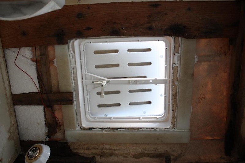 dabei hab ich , um weitere holzfäulnis zu vermeiden, ein altes kunststoffschneidbrett zugeschnitten und und daran die luke festgeschraubt(da kommt kein wasser mehr rein)(also denk ich)