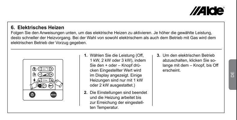 wenn alle eingeschaltet ist kommen zu den 6000 W der Gasheizung noch mal 3000 (exakt sogar etwas mehr ich glaube 3150) Watt an Elektropatrone dazu.. 9KW Heizung bei Strom und Gas Die strangsperre in der Garage teilt die Wärmezufuhr hinten am Bett In der Bedienungsanleitung meiner Alde 3010 steht, dass bei eingeschaltetem Gasbetrieb und Elektrobetrieb, bei Vorhandensein von 230 Volt die Alde Heizung Strom auswählt. Da wird nicht zusätzlich mit Gas geheizt.