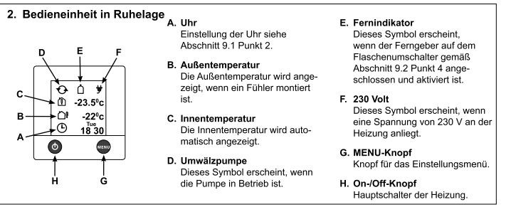 Du musst im Menü vom Display ( Symbol Schraubenschlüssel) die KW und die Ampere einstellen wenn die E-Patrone heizen soll.Nachdem ausschalten ist die Einstellung verloren und muss immer wieder neu eingestellt werden. Mofa Moin Moin,