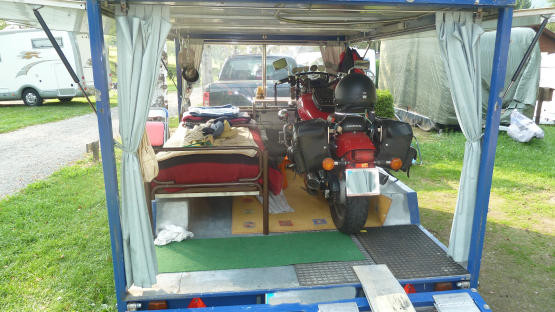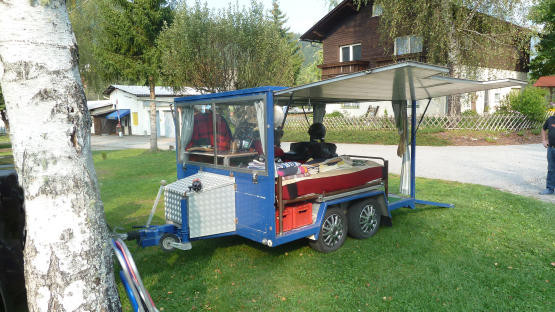 Auf einem Campingplatz in Österreich bestaunte ich diesen Selbstausbau. Wenn das Motorrad vom Hänger runter ist, kann man Stuhl und Tisch ausklappen. Wasserversorgung auf dem Dach. Die Wände hochklappbar ergeben ein Vordach. Gaskocher selbstverständlich.