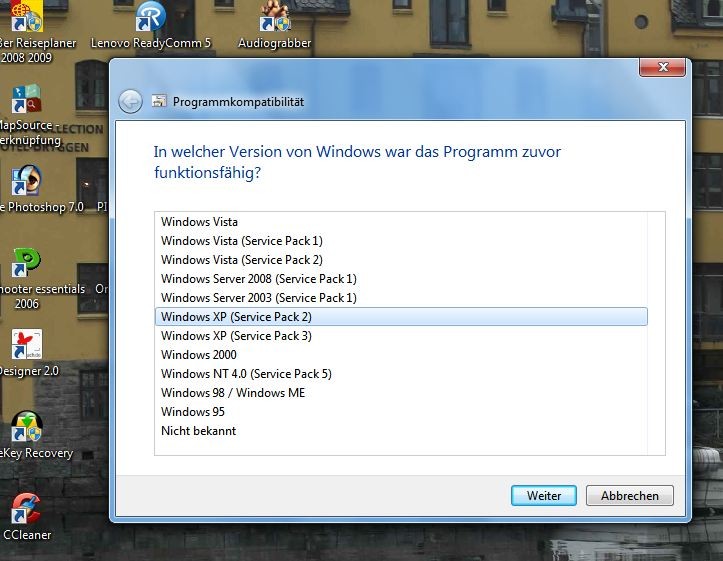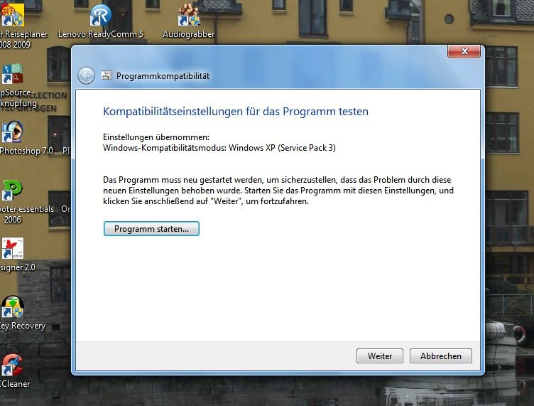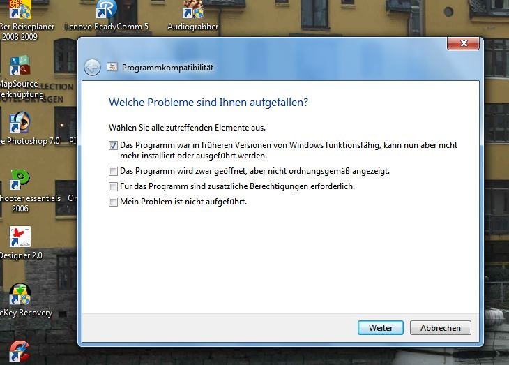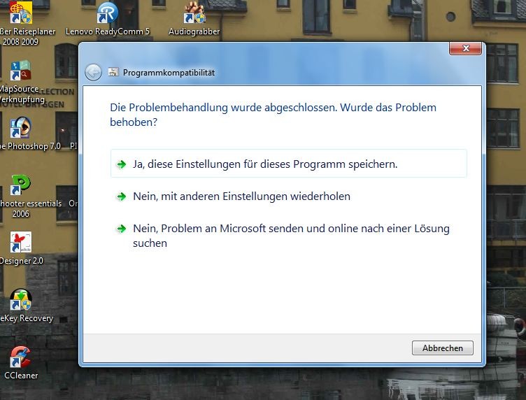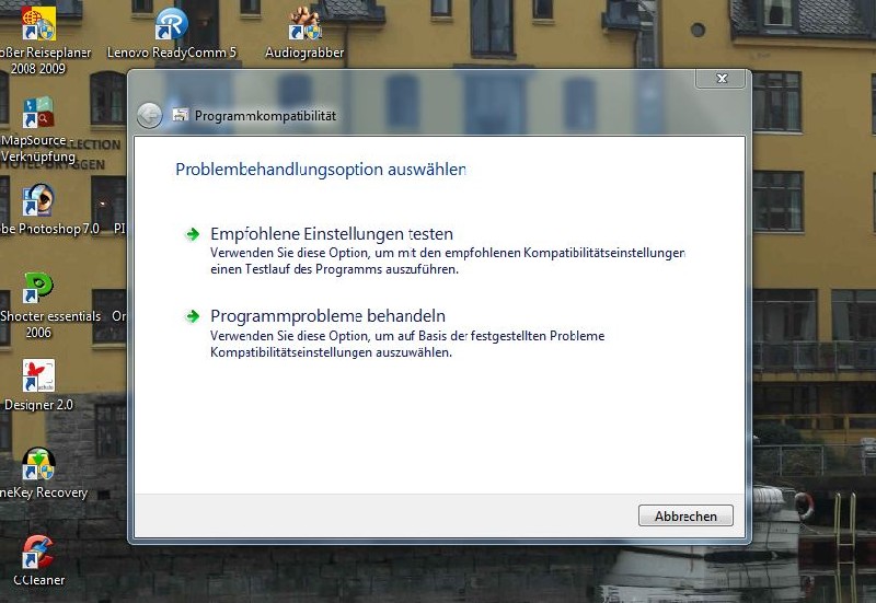 wenn Du auf dem Desktop das icon vom großen Reiseplaner mit der rechten Maustaste anklickst, sollte eine Auwahl angezeigt werden, die beginnt mit Öffnen, dann folgt "Behandeln von Kompatibilitätsproblemen. Das kann ich leider nicht als Screenshot einfügen, wohl aber die darauf folgenden nächsten Schritte. Hier die einzelnen Auswahlbildschirme: