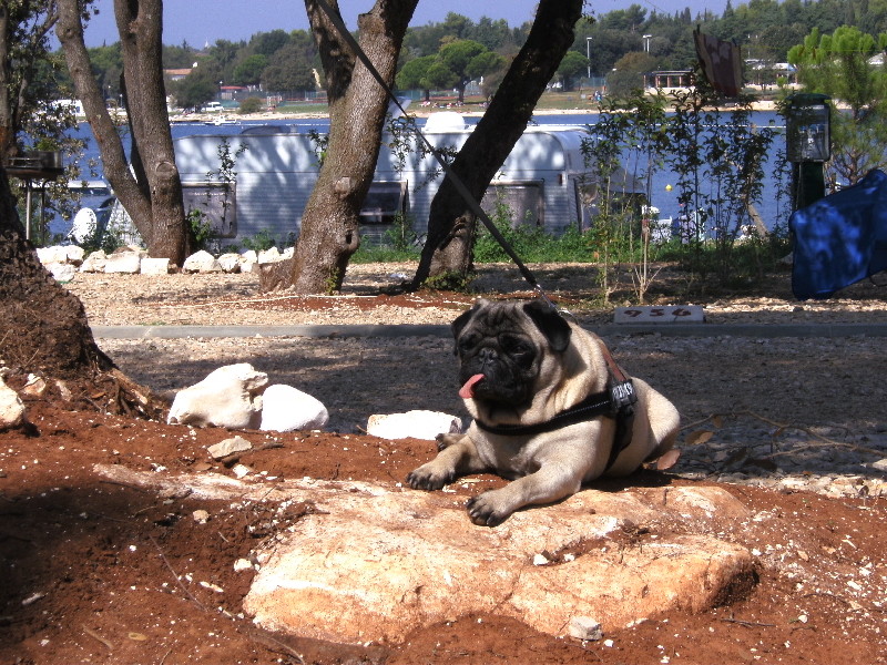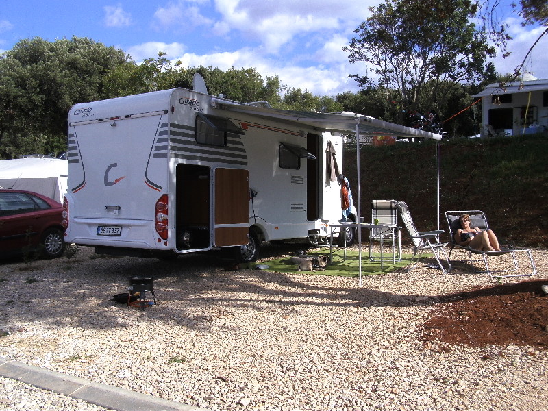 Wo wir Glück hatten, zwei Tage vor unserer Ankunft hat eine furchtbare Bora gewütet und sehr viel Schaden angerichtet. Diese Fallwinde entstehen in dieser Region immer wieder ohne Ankündigung und sind nicht zu unterschätzen. Wir hatten Glück und nur in einer Nacht Regen, welcher aber äußerst heftig war. Hierfür sind die geschotterten Böden gut, da die drunterliegende Roterde jeden Platz in ein Schlammbad verwandeln täte.