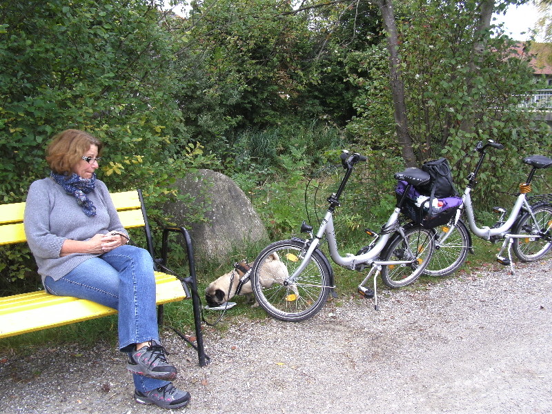Geweckt von stechenden Sonnenstrahlen wurden nach dem Frühstück die Klappräder und der von Muffin so gehasste Hundehänger aus der Heckgarage gezerrt. An der Drau entlang führt vom CP ein gut markierter Radweg bis hinein nach Villach. Geschätzt etwa 8-10 Kilometer und auch für die Gegend recht flach, aber für einen ungeübten Sesselpupser und ein 20" Klapprad mit Kampfmops im Schlepp war es eine arge Herausforderung. Dazu kommentierte Muffin jeden Pedaltritt mit furchterregendem Gejaule, Gejunkere oder Gebelle.