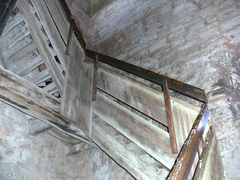 Für mich kam dann die Mutprobe meines Lebens. Mit Höhenangst behaftet stieg ich den Glockenturm hoch. Es sind offene abgetretene Holztreppen, die nicht vertrauenserweckend aussehen und man kann durch die Treppen erkennen, wo man unten aufschlägt.