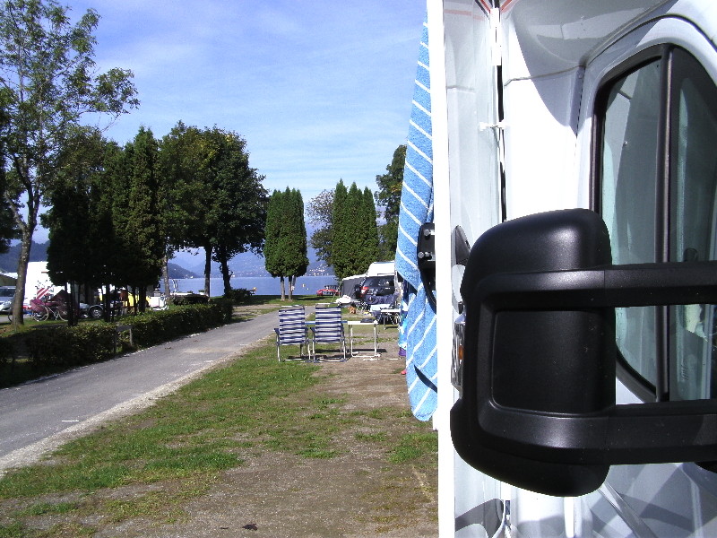 Der angesteuerte Luxuscampingplatz bot zwar vieles, aber halt keinen Zugang zum See, denn er war auf der anderen Seite. Als dann noch der ohnehin astronomische Preis steigen sollte, wenn wir nicht um 9:00 verschwinden, beschlossen wir weiter zu suchen. Ein kleinerer Familiencampingplatz schräg gegenüber war nicht viel billiger, aber man schaute auf den See, wir hatten die Option um 12:00 abzufahren und bekamen ein Stündchen Internet dazu.