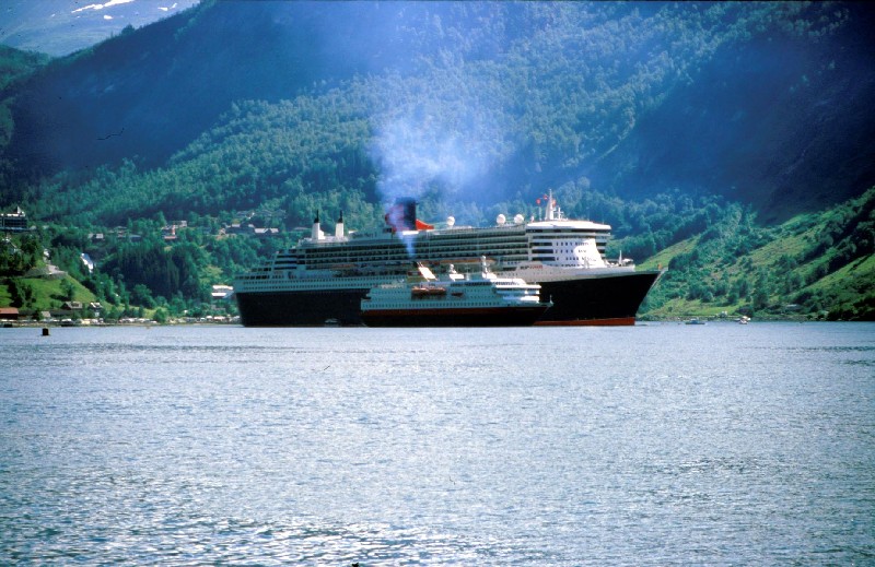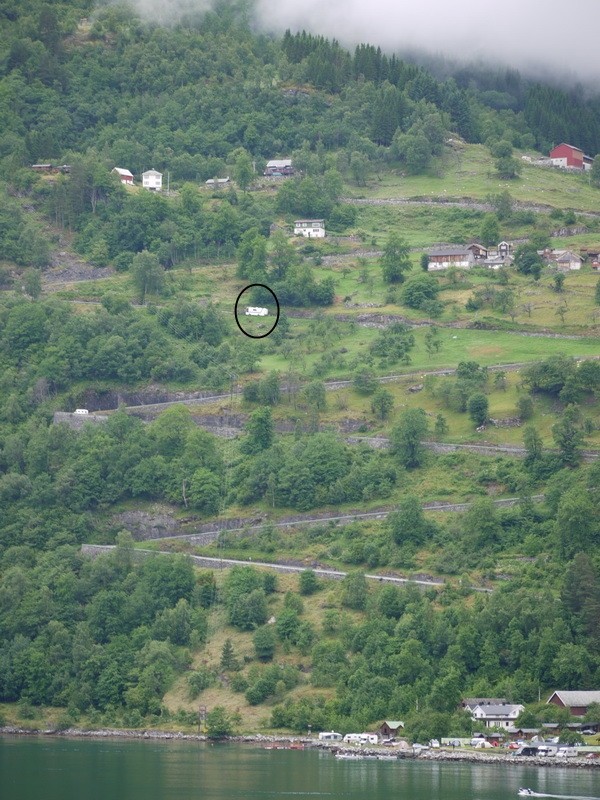 Vor 40 Jahren gab es da nur eine Kombination aus Post-Fähr-Tank-Stelle mit Kiosk und 2 Dutzend Häuser verstreut darum. Mir ist damals nach der Abfahrt von Geieranger ca. 12km den Pass hoch die Kupplung an meinem Campingbus (BJ 1957) verreckt. Schalten war nicht mehr möglich. Also Bus auf der engen Passstrasse händisch gewendet, 2. Gang eingelegt und wieder nach Geieranger runter. War bei dem Verkehr, nämlich keiner, damals möglich. Dort am Kiosk die Sackkarre des Postbusses geliehen und kurz den Motor ausgebaut (30min) und festgestellt, dass eine Kupplungsfeder gebrochen war. Der Tankwart-Post-Kiosk-Mann hat für uns eine ähnliche Feder aufgetrieben, die wir dann eingebaut haben. Der Motoreinbau einschließlich Heckblech dauerte 45 min.. Leider war die Kupplungsfeder etwas schwach, sodass wir noch einen Bügel über das Kupplungspedal montieren mussten, um den Kraftschluss Motor-Getriebe herzustellen. Also, beim Kuppeln rein in den Bügel, Pedal treten, schalten und Pedal wieder hochziehen. Diese Reparatur hat über die Heimfahrt hinaus noch lange gehalten. Ist immer wieder eine schöne Erinnerung, wenn das Wort Geieranger fällt. 20 Jahre später gab es diese alte Passstrasse nicht mehr, lediglich ein Wendelstück davon haben sie stehen lassen. , Helmut damals mit VW-Westfalia-Bus, 2 to und 30 PS Vom ähnlichen Standpunkt mit der Queen Mary 2