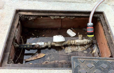 Man sollte fürs Entleeren des Grauwassers möglichst so hinstehen, dass das Wasser möglichst direkt in den Gulli abläuft, der oft durch Laub etwas verstopft ist. Links sieht man den Stromkasten. Bei der Einweihung gab es damals kostenlosen Strom, ob das heute noch der Fall ist haben wir nicht ausprobiert. Rechts sieht man den Gullideckel, unter dem sich der Frischwasserhahn befindet.
