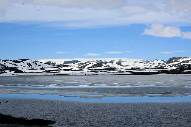 Die Ernüchterung kommt schnell. Wir sind zum dritten Male zur gleichen Zeit (immer Ende Juni) hier. So haben wir die Hochebene noch nicht gesehen. Es liegt teilweise noch ordentlich Schnee. Wege kann man nicht wirklich erkennen. Es ist schwierig, zwischen noch zugefrorenen Gewässern und reinen Schneefeldern zu unterscheiden. So wird das nichts Vernünftiges. Sonst lag bisher um diese Jahreszeit hier kaum mehr Schnee. Der Besitzer vom CP in Geilo sprach von ca. 4 Wochen Rückstand der Natur. Der Winter ging dieses Jahr sehr spät. Ich hatte dies befürchtet, da ich im Frühjahr immer wieder Webcams und diverse Bilder auf meiner Lieblingsseite --> Link angeschaut habe. Das Wetter wird langsam etwas besser. Wir fahren runter zum Hardangerfjord. In Eidfjord empfängt uns Sonnenschein und Wärme…und die Aida blue, die dort vor Anker liegt.