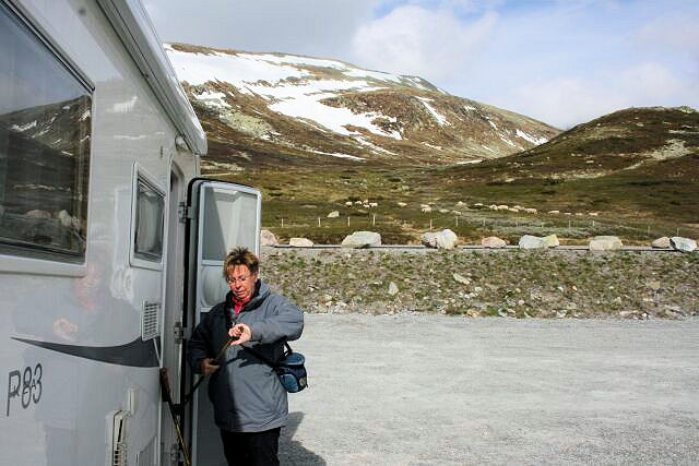 Von Larvik dann noch 150 km Landstraße und wir kommen am Abend im Fjell unterhalb des morgigen Zieles, die Besteigung des Gaustatoppen, an. Auf ca. 1100m haben wir einen herrlichen Übernachtungsplatz mit Weitblick gefunden!