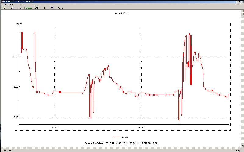 Also mein Spannungsverlauf selbst mit Efoy, die sich auf Automatik bei 12.2V einschalttet und leider schon bei 13,2V wieder ausschaltet,