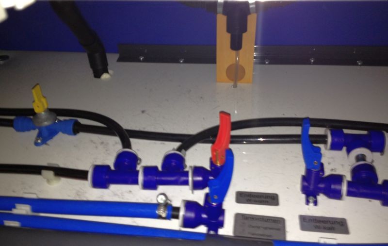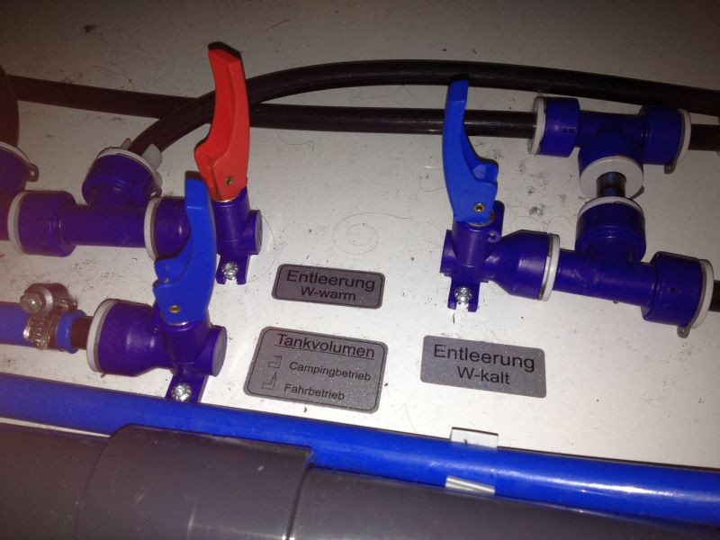 2 blaue = 1x Fahrbetrieb oder Campingbetrieb, 1x = Kaltwasser 1x rot = Warmwasser 1x gelb = ?? Hab alle 4 geöffnet,das Wasser ist aus dem Boiler und den Leitungen über einen dünnen Schlauch am Unterboden abgelaufen.