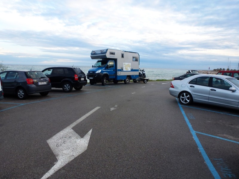Nach einem Tag Rast reisten wir in Spanien ein und fuhren über Barcelona hinaus nach Sitges. Dort übernachteten wir an einem Parkplatz direkt am Meer. Im Stellplatzführer ist dieser Platz als Womo-Stellplatz eingetragen, aber das ist er definitiv nicht! Die erlaubte maximale Fahrzeuglänge beträgt auf dem Platz 5,80m und wir sind mit dem Anhänger fast neun Meter. Trotzdem konnten wir noch einen schönen Platz ergattern – allerdings ragte unser Fahrzeug ein paar Meter in eine schraffiert markierte Zone. Der Parkwächter sagte aber nichts und so schliefen wir bei tosender Meeresbrandung (ziemlich lauter Lärm) recht gut. Freies WLAN gab es von einem nahegelegenen Hotel.