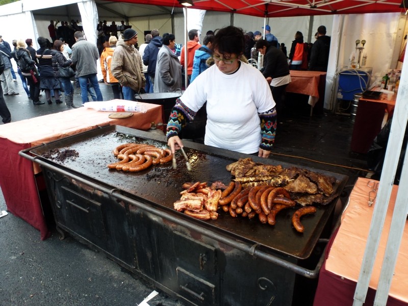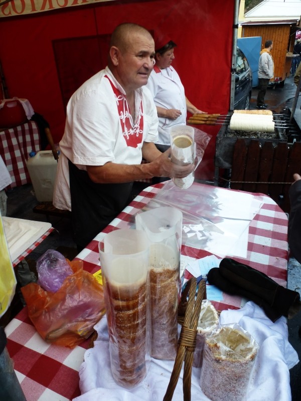 Das warme Thermenwasser tut uns gut und erinnert uns an Island, wenn sich der Körper im warmen Wasser befindet und der Kopf in der Kälte. Auch nach einigen Tagen ist das Wetter immer noch trübe und der Wind wird auch noch kälter (allmählich freue ich mich auf Südspanien!). Lediglich zum Markt wird es nach teils heftigen Regenfällen pünktlich etwas wärmer und trocken. Wir nutzen natürlich die Gelegenheit, einen ungarischen Markt zu besuchen. Viele Firanten sind dem fahrenden Volk der Sinti und Roma zuzuordnen und verkaufen allerlei Tand. Aber natürlich gibt es auch ungarische Spezialitäten – deswegen sind wir ja auf den Markt gegangen (verfressen wie wir sind…). Original ungarischer Paprika und ungarische Salami (Kolbász) sind auf unserem Wunschzettel und gelangen auch in unseren Rucksack. An vielen Ständen gibt es auch einheimisches Essen, angefangen von gebratener Blutwurst über Schaschlick, Gulasch, Reiberdatschi (mit Knoblauchsauce) bis hin zu diversen Süßigkeiten. Bei letzteren hat uns vor allem ein Spieß fasziniert, auf dem ein Teig gerollt und dann über offenem Feuer knusprig gebraten wird; anschließend wird diese Spießrolle in Zimt-Zucker gewälzt und schmeckt warm wie kalt köstlich.