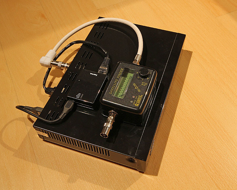 Aus diesem Grund sollte man den Satfinder künftig aus der Leitung nehmen, sobald die Antenne eingestellt ist. Damit man sich dabei nicht zu Tode schraubt, habe ich die Schraubanschlüße mit diesen Adaptern Link zum eBay Artikel steckbar gemacht. Das Kabel von der Antenne hat ebenfalls den passenden Stecker ohne Gewinde. Den Satfinder habe ich mit einem Magnetklebeband fest und doch abnehmbar auf dem Satreceiver plaziert.