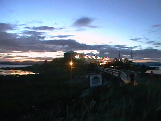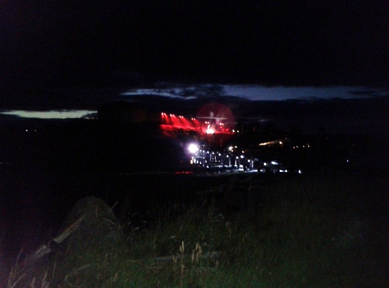 Diesmal ist die generalprobe in vollem gang, wir wollen nicht stören, fahren bis an das ende der autoreihe, stellen gleich ohne langes rangieren den motor ab und drehen noch eine runde, natürlich leise und zu fuß auf dem parkplatz, bezahlen unsere übernachtungsgebühr, reden mit dem einweisern und hören noch das schlußfinale der mitternachtsoper. noch ein foto von der beleuchteten kulisse eine halbe stunde nach mitternacht: