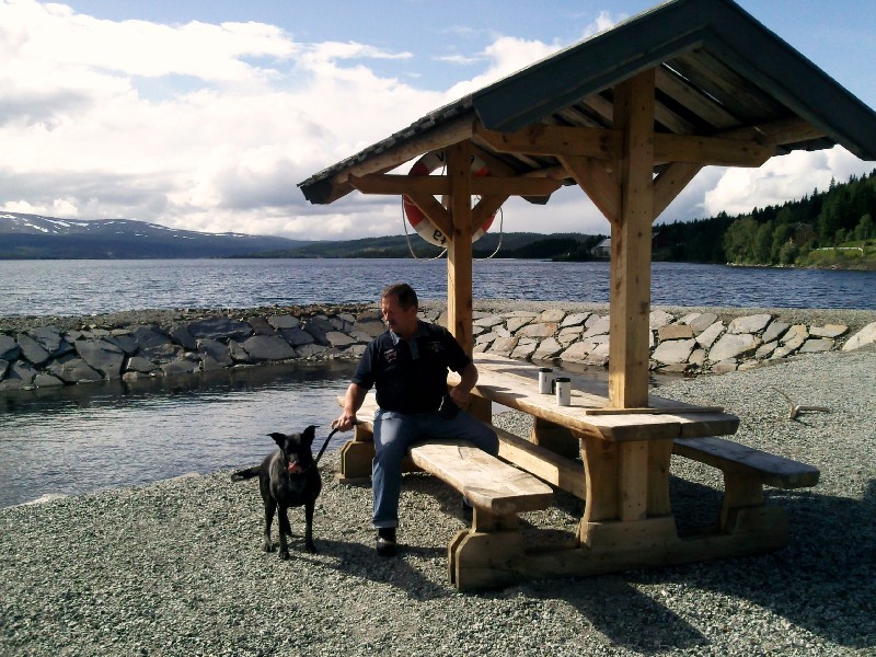 Dort setzen wir uns erstmal auf die dort vorhandenen sehr stabilen rastplatz-sitzgarnituren und können den nun trinkbar warmen Statoil-abo-kaffee trinken.
