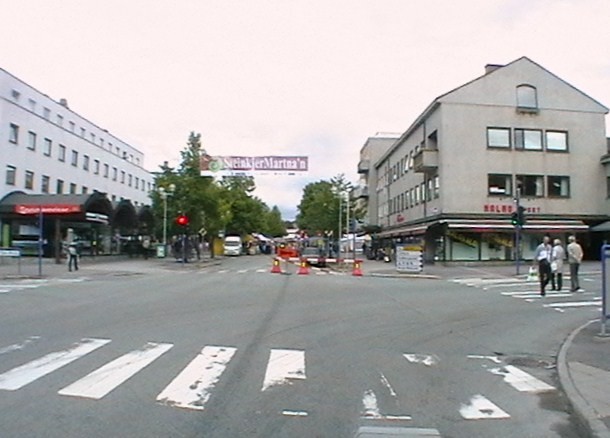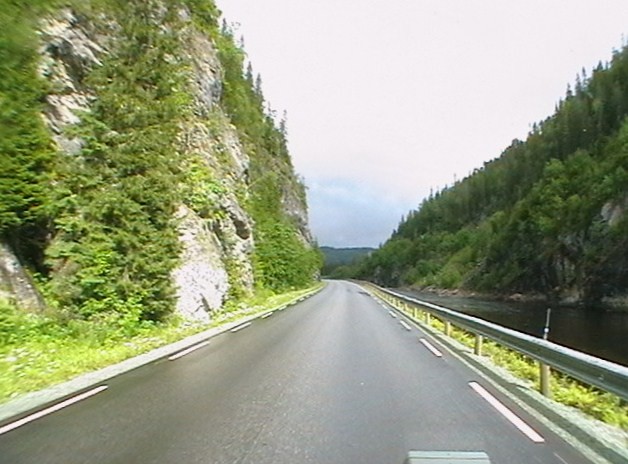Hier noch dreispurig, wegen einer kriechspur bergauf, dann dort wo die felsen fast bis an´s wasser gehen nur noch zweispurig. Passiert hier mal ein schwerer unfall, was durch den straßenverlauf schön öfter war, gibt es keinerlei umleitungsmöglichkeit und sämtlicher verkehr auf Norwegens hauptverkehrader kommt zum erliegen. Schaut auf die karte, die einzige umleitungsstrecke wären einige hundert kilometer über Schweden. Aber heute ist wenig verkehr und wir sind ruck zuck in Steinkjer, wo wir die E 6 nach rechts wieder verlassen, um eine nebenstrecke zufahren und müssen deshalb durch stadtzentrum, was aber wegen des Großen Steinkjer Wochenendmarktes teilweise abgesperrt ist.