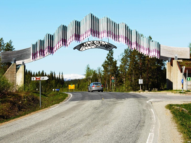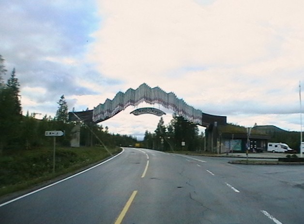 In Namsskogan stoßen wir wieder auf die E 6, fahren wieder in nördliche richtung und passieren die grenze nach Nordnorge, welche durch einen stilisierten nordlichterbogen gekennzeichnet ist.